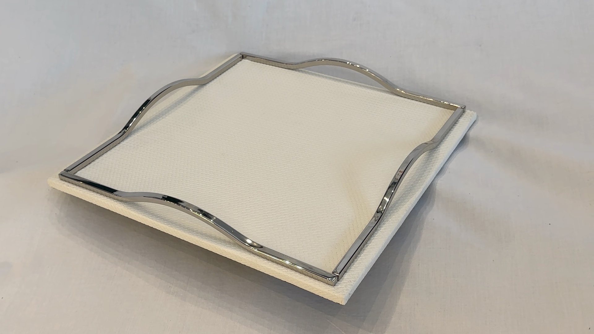 Plateau en cuir, bois et métal. Luxe et texture pour un service raffiné.