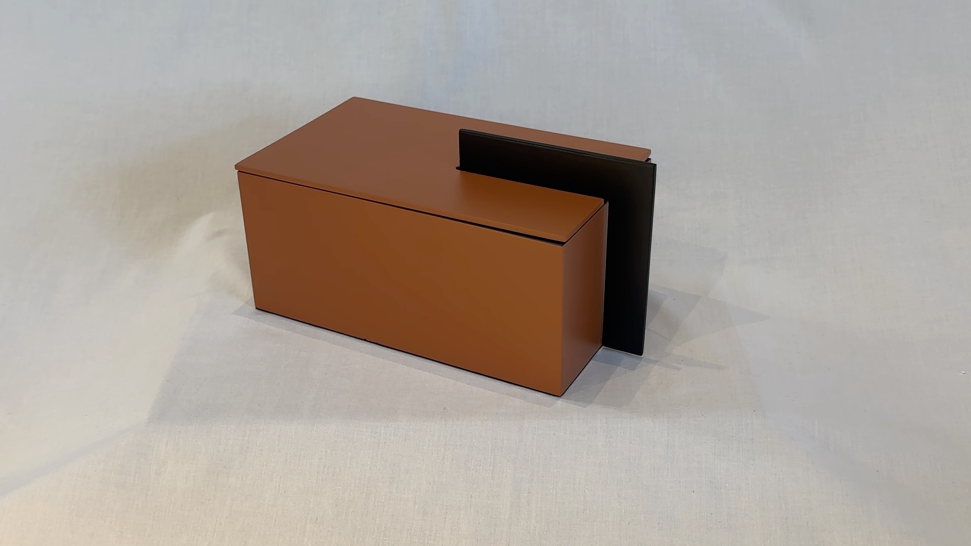 Grande boîte de rangement grise en pierre et cuir. Combine style et fonctionnalité.